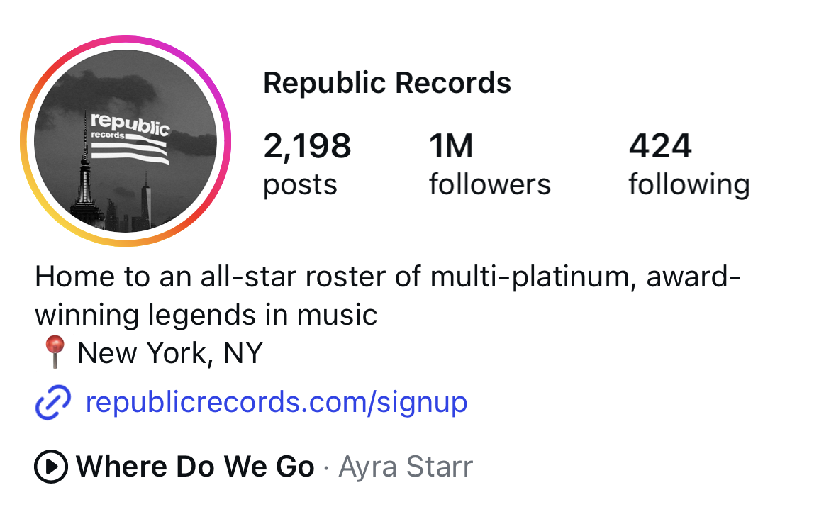 Problem: Position Republic Records as one of the first major record labels to surpass 1 million Instagram followers, elevating the brand into a defining leader in digital influence, cultural relevance, and audience engagement.